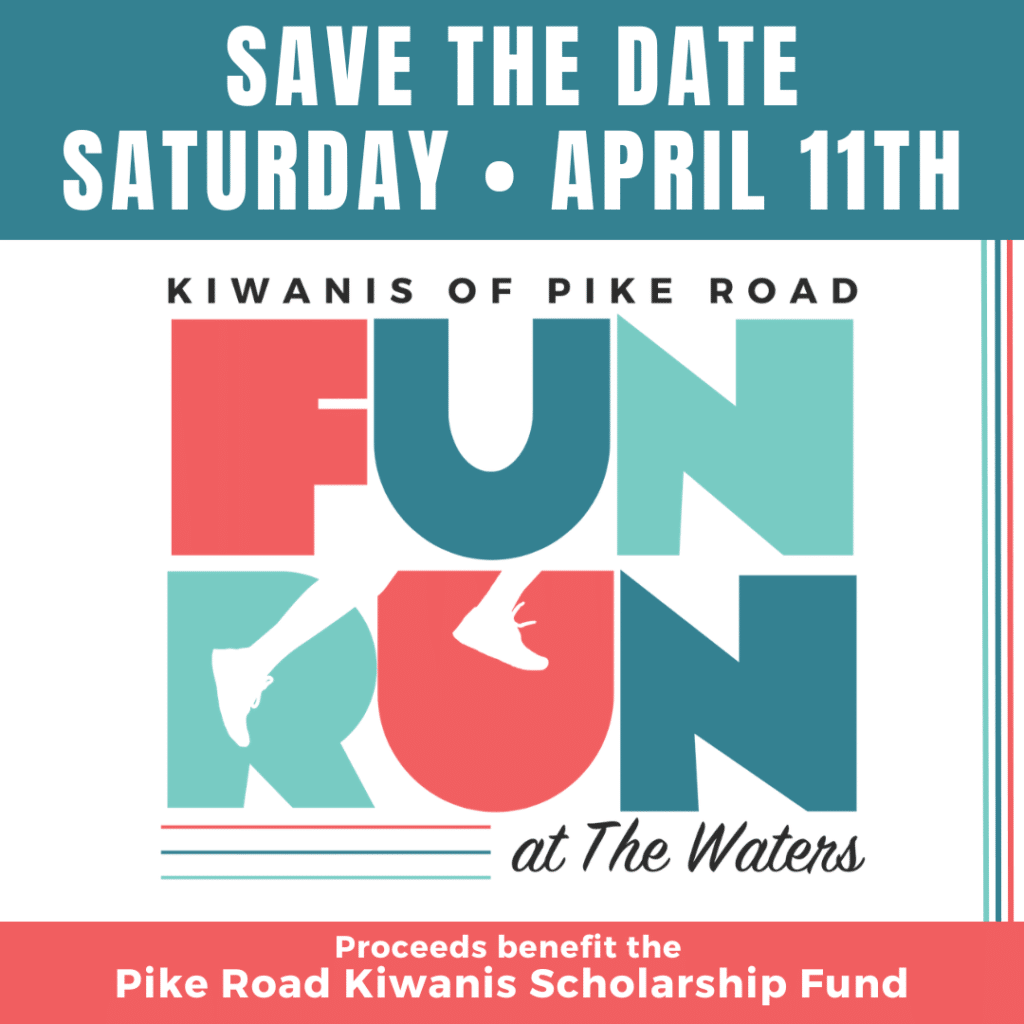 Join Kiwanis of Pike Road at The Waters for the Pike Road Family Fun Run on Saturday, April 11th! Proceeds from the 5th Annual Family Fun Run will help support the Pike Road Kiwanis Scholarship Fund.
