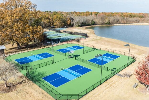 Our first-class lighted tennis facility provides a perfect venue for the beginner or seasoned professional. Our lighted tennis courts and pickleball courts feature a Plexicushion surface, designed to provide players with the highest levels of surface performance and cushioning. Courtside seating allows for a great view of the court and Lake Sweet T, one of our community lakes.
