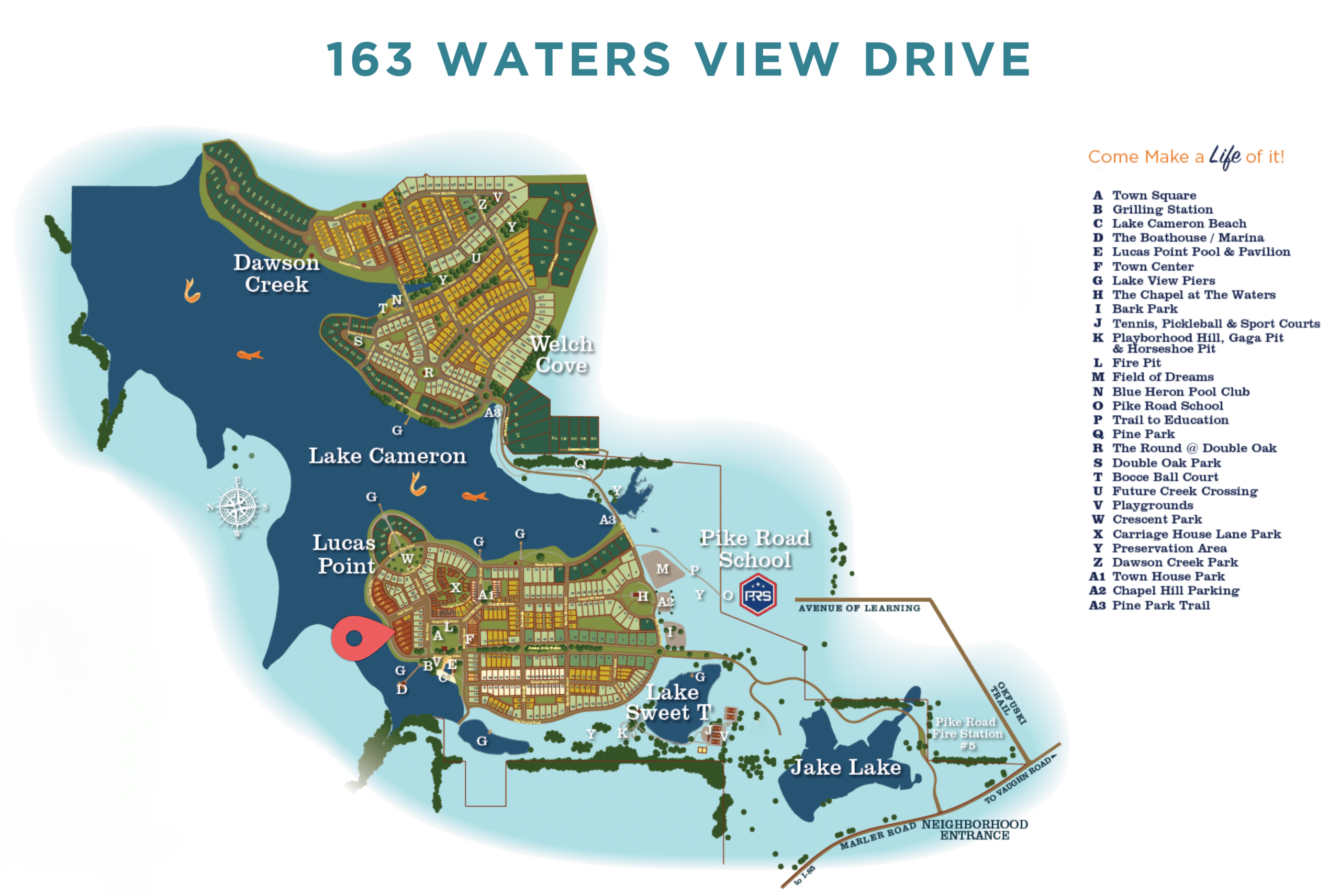 Beautiful views from The Waters! This spectacular homesite is perfectly situated in the Lucas Point Hamlet of The Waters. Vacation at home right here in Pike Road. World class fishing, boating, 2 swimming pools, 5 tennis courts, beach, dog park, town square, fire pit, soccer field, playborhood hill, bocce ball, pavilions, sport court, gaga pit, kayaking, canoeing, playgrounds, parks, Trail to Education (trail to school) and much, much more. Shop & Dine at our Town Center businesses! 2.5 miles off I-85, Exit 16 & less than 15 min. to Montgomery’s EastChase Shops & Chantilly Pkwy. Contact Pike Road School (334-420-5310) to verify schools & zoning. Seller has right to approve buyer’s mortgage lender. Come Make a Life of It. Make Your DREAM Vacation Your Everyday Life.