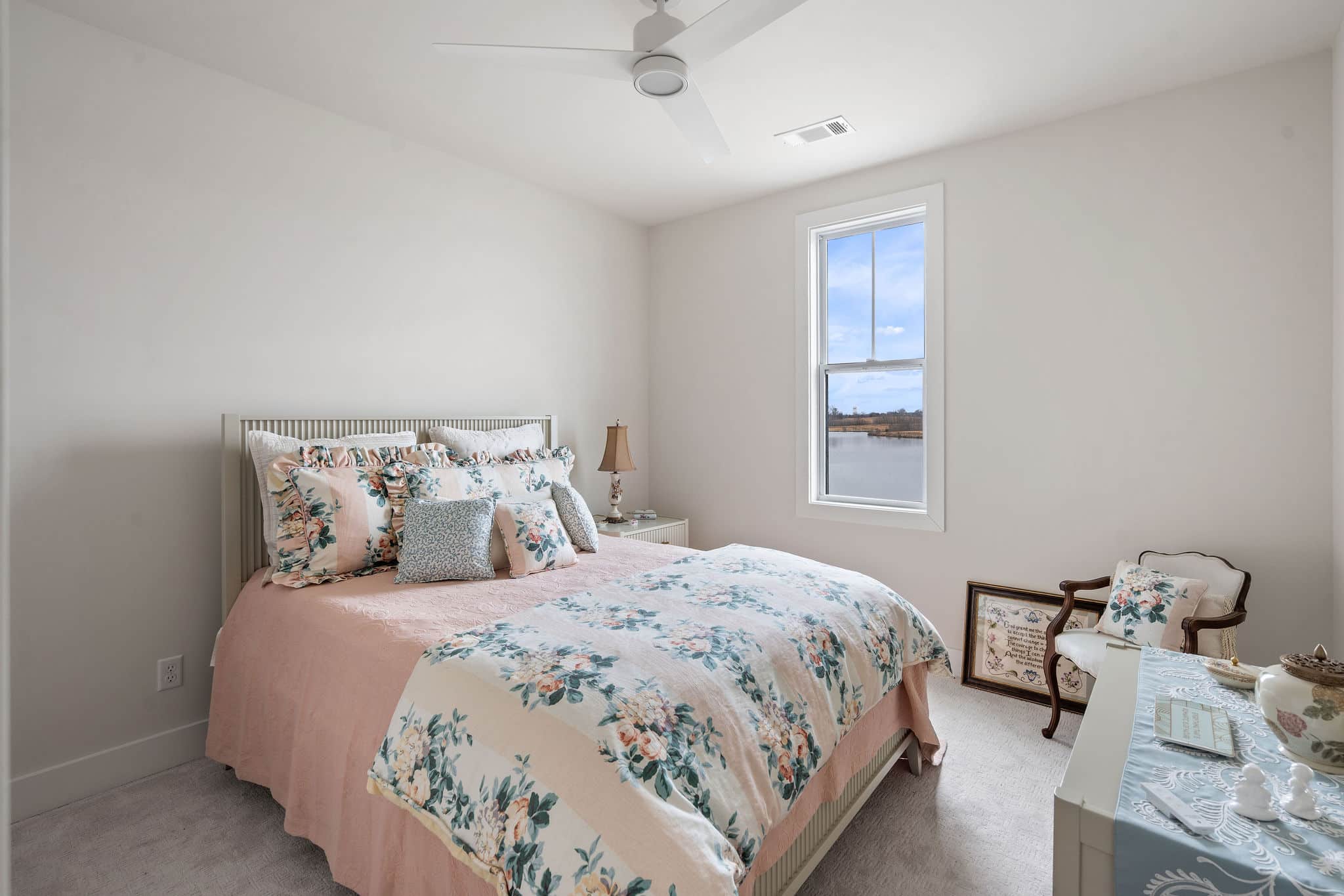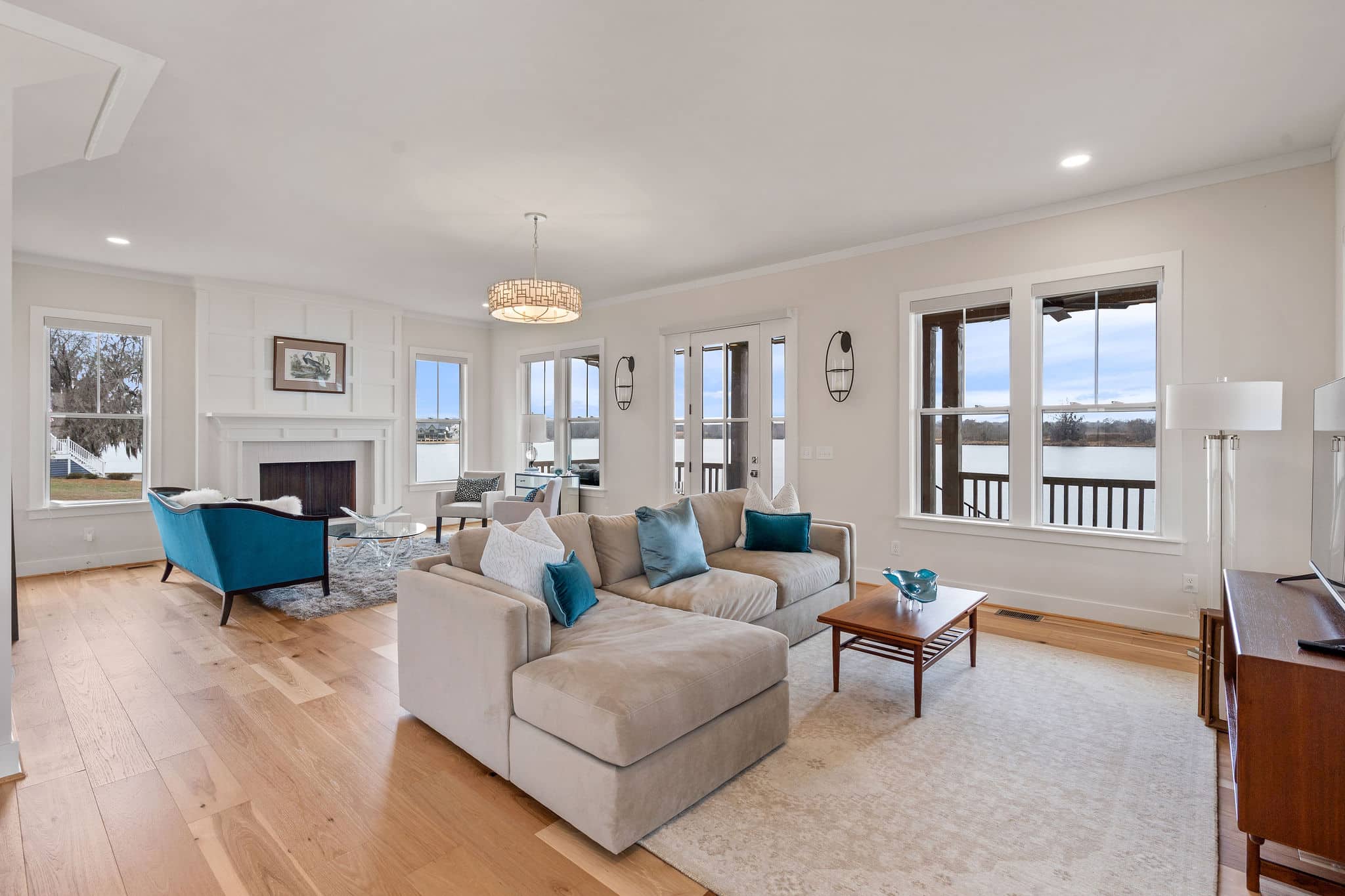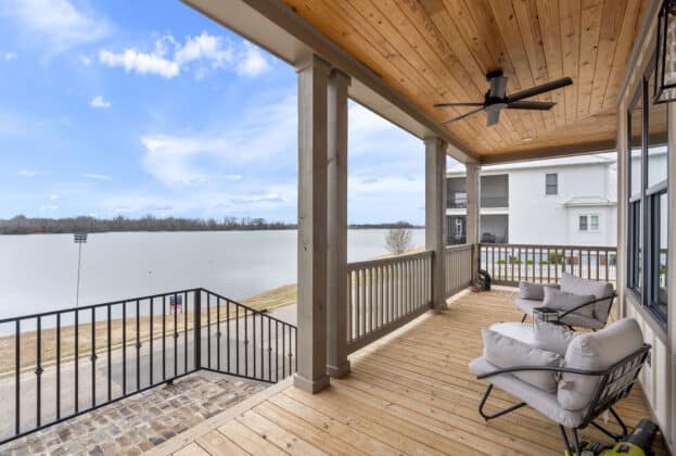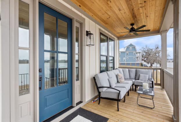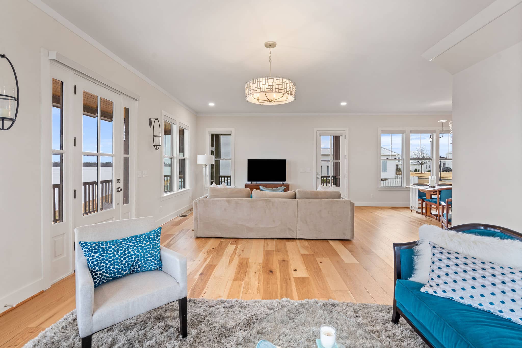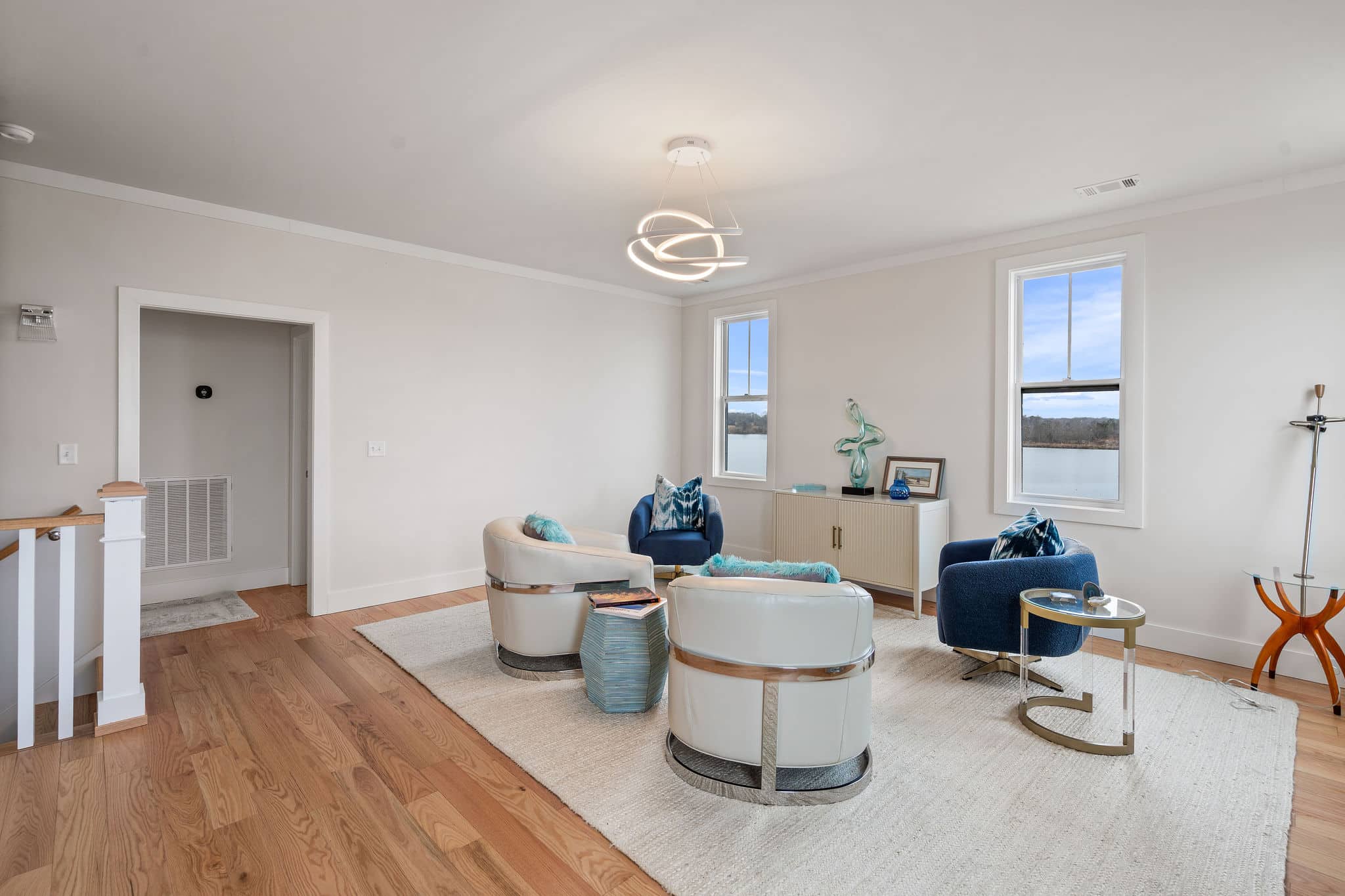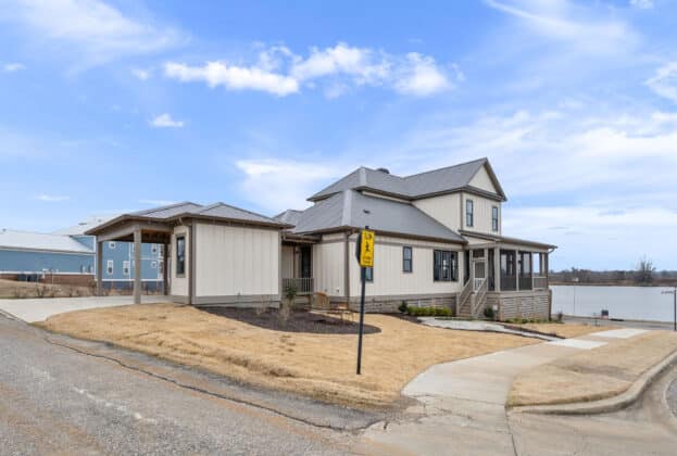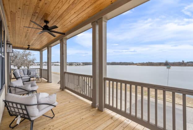 Perfectly positioned on the corner of Lucky Lane and Lake Cameron Drive, this custom-built 2025 lakefront home captures panoramic water views that are simply unforgettable. From the front and side porches to the living room, dining area, and kitchen, nearly every main living space is framed by picture-perfect views of Lake Cameron, creating a daily scene that feels like a permanent vacation. Beautiful hardwood floors flow throughout the home’s main areas while the bedrooms and baths offer comfort and privacy in all the right places. The magazine-worthy kitchen is truly the heart of the home, featuring floor-to-ceiling cabinetry with exceptional storage, gorgeous countertops, and a stunning island accented by a quartz waterfall on both sides. A double oven range makes entertaining effortless, while the open-concept design ensures you never miss a sunset over the water. The luxurious primary suite is a private retreat with designer tile wall accents, lighted mirrors, a breathtaking shower, and a massive walk-in closet that offers space for organization. Upstairs, a spacious bonus loft provides flexible living space, complemented by two additional bedrooms and a beautifully appointed bath with impressive tile and countertop finishes. Thoughtful exterior upgrades include professionally designed landscaping, a charming courtyard-style patio in the side yard, irrigation system, rain gutters, and spacious exterior storage. Move-in ready and practically new, this home offers a rare opportunity to own waterfront property at The Waters at an exceptional value—truly priced to sell and nearly impossible to replicate at this price point. Living at The Waters means embracing a lifestyle unlike any other, with access to lakes for fishing and boating, swimming pools, walking trails, pickleball and tennis courts, parks and greenspaces, plus a vibrant town center with civic spaces and local businesses. This is more than a home—it’s a front-row seat to lakefront living at its finest.