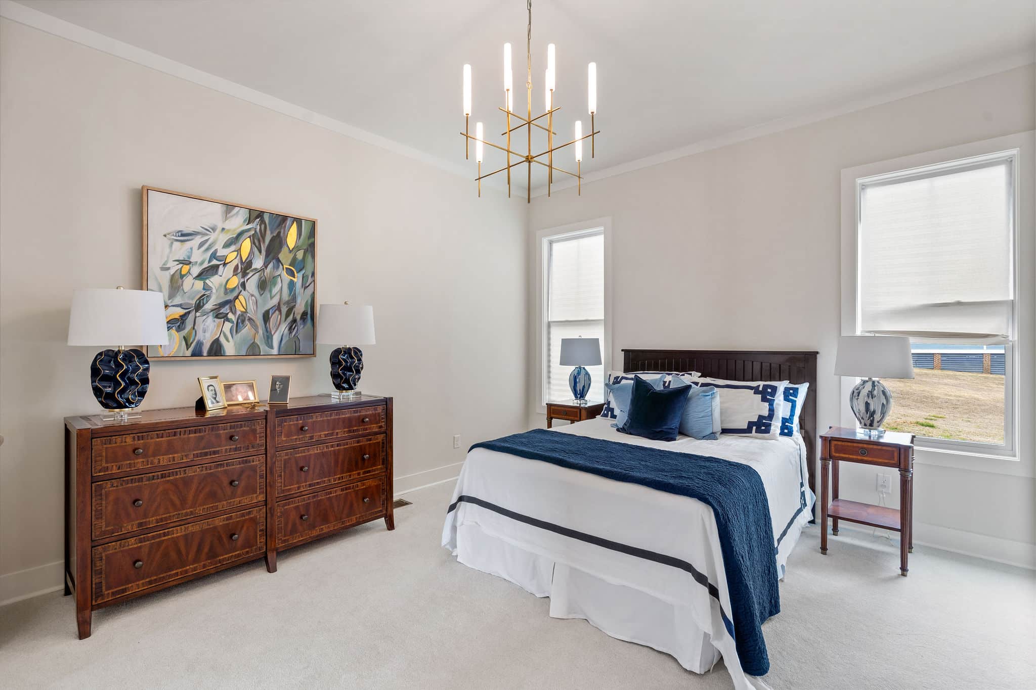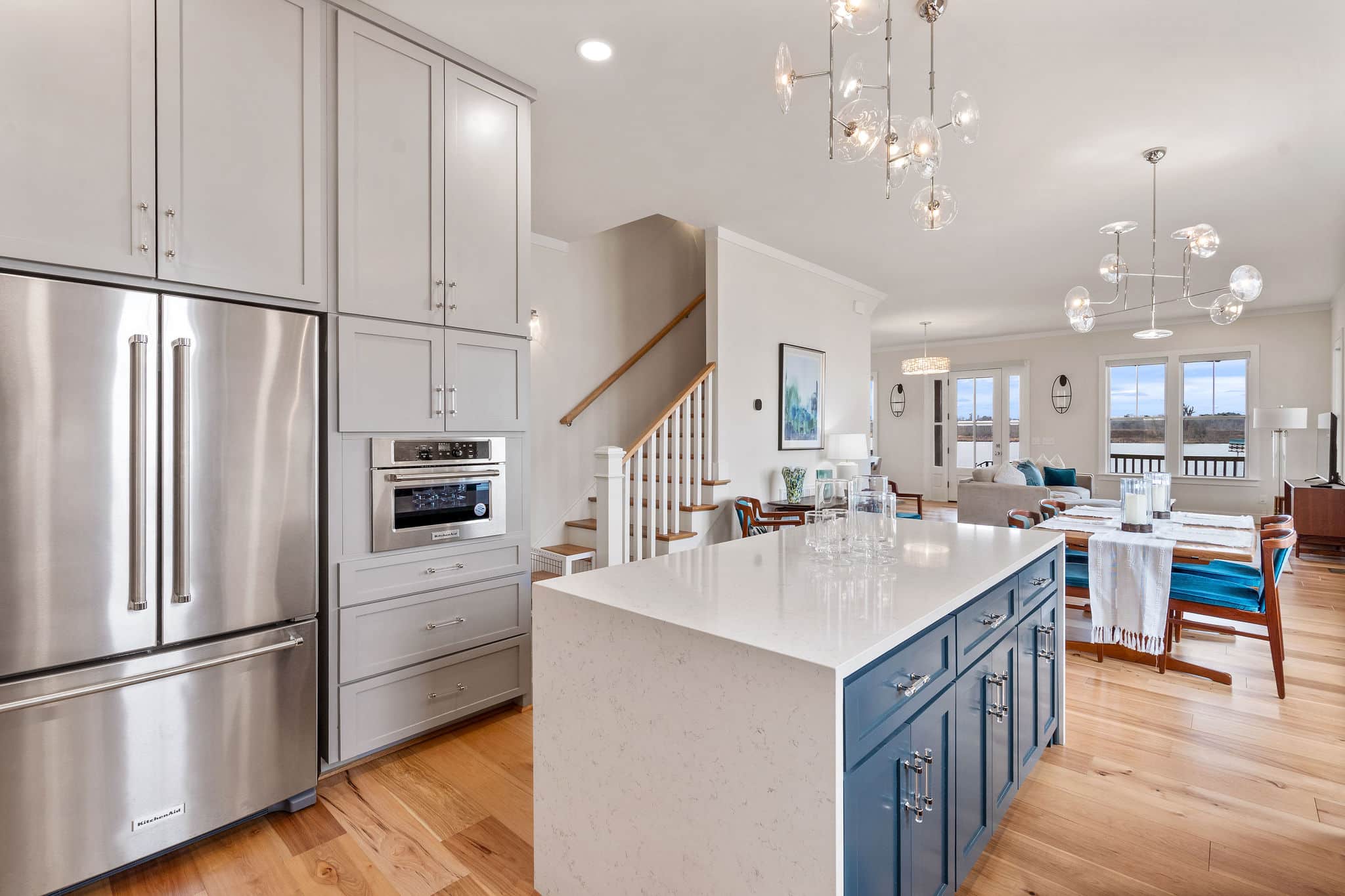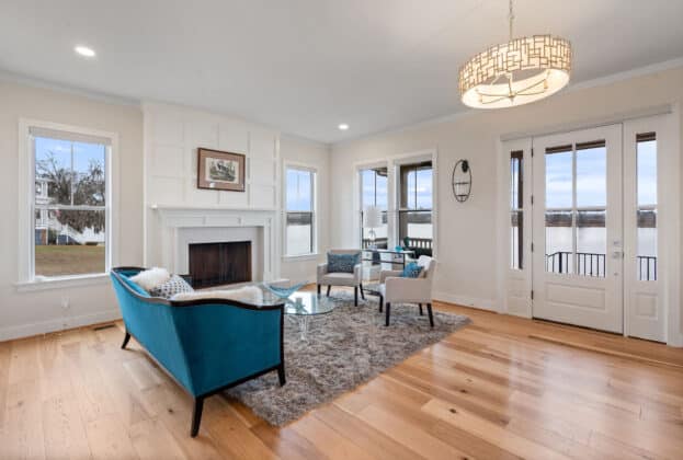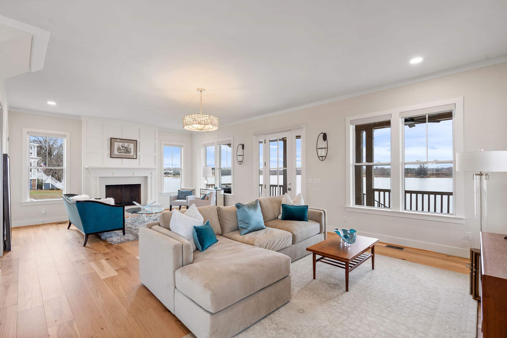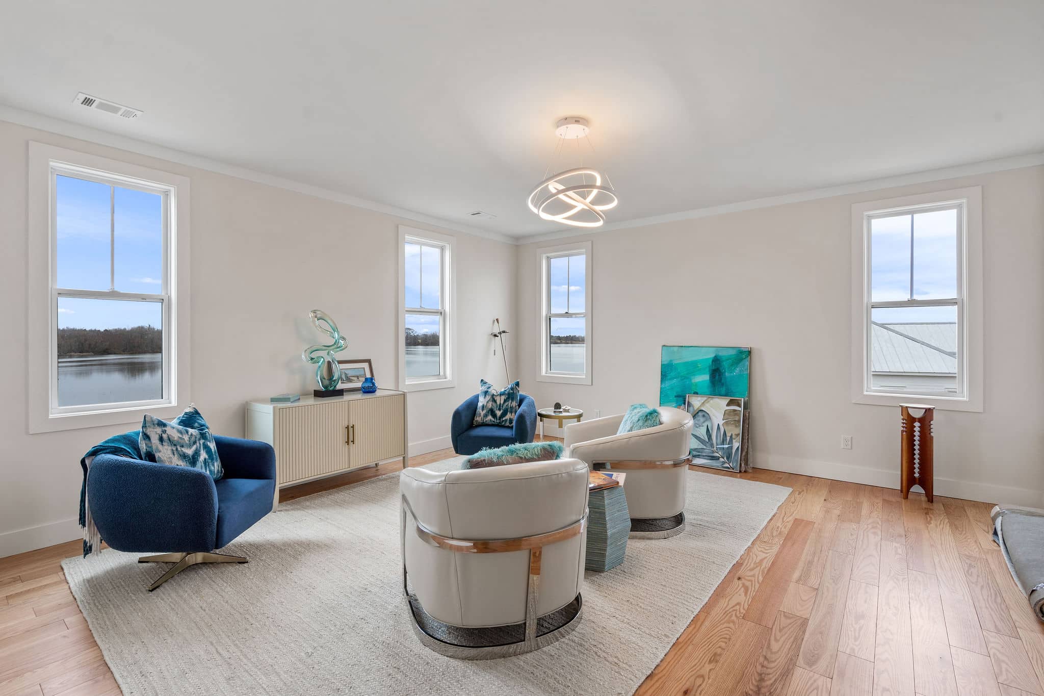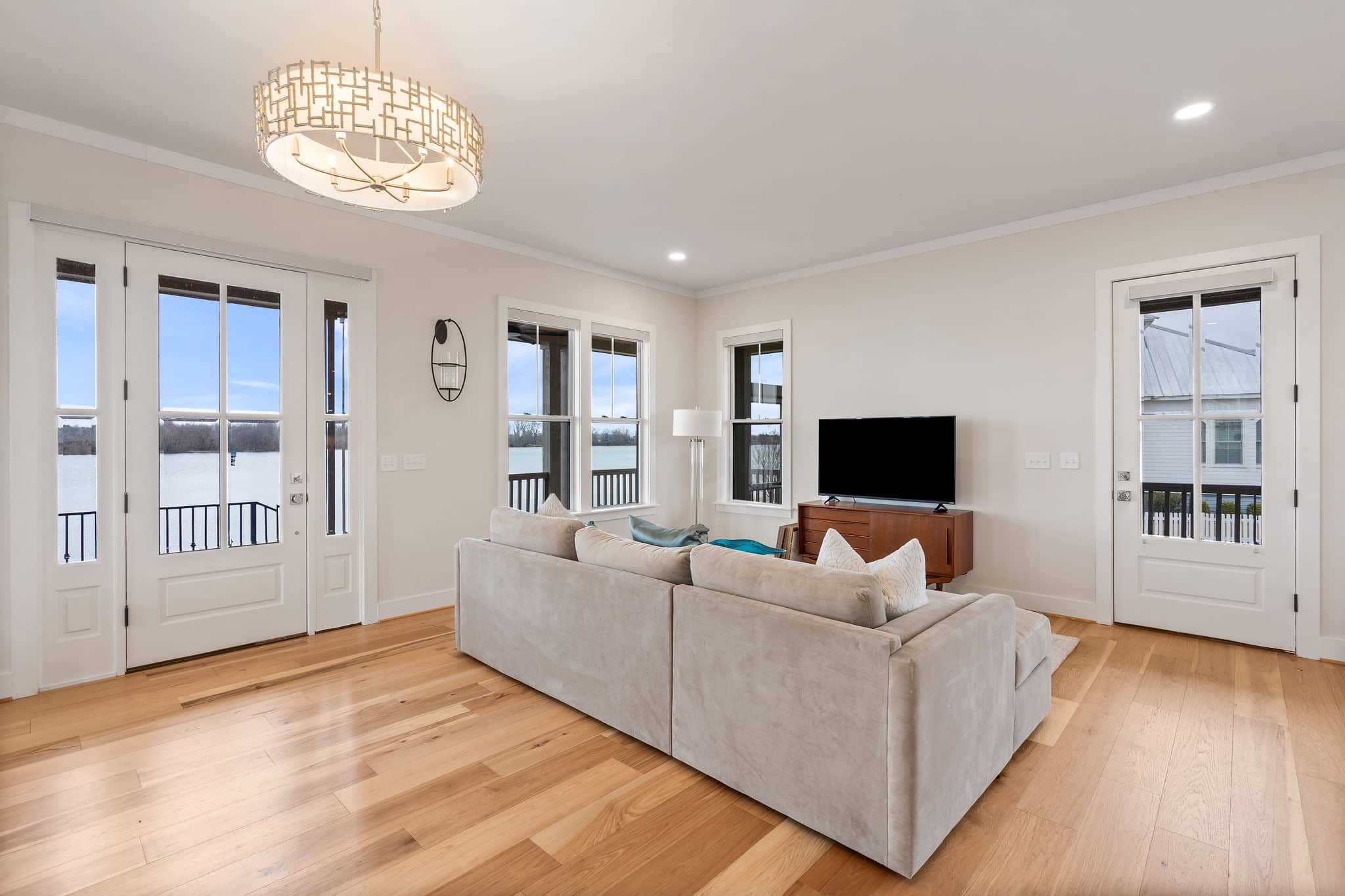 Perfectly positioned on the corner of Lucky Lane and Lake Cameron Drive, this custom-built 2025 lakefront home captures panoramic water views that are simply unforgettable. From the front and side porches to the living room, dining area, and kitchen, nearly every main living space is framed by picture-perfect views of Lake Cameron, creating a daily scene that feels like a permanent vacation. Beautiful hardwood floors flow throughout the home’s main areas while the bedrooms and baths offer comfort and privacy in all the right places. The magazine-worthy kitchen is truly the heart of the home, featuring floor-to-ceiling cabinetry with exceptional storage, gorgeous countertops, and a stunning island accented by a quartz waterfall on both sides. A double oven range makes entertaining effortless, while the open-concept design ensures you never miss a sunset over the water. The luxurious primary suite is a private retreat with designer tile wall accents, lighted mirrors, a breathtaking shower, and a massive walk-in closet that offers space for organization. Upstairs, a spacious bonus loft provides flexible living space, complemented by two additional bedrooms and a beautifully appointed bath with impressive tile and countertop finishes. Thoughtful exterior upgrades include professionally designed landscaping, a charming courtyard-style patio in the side yard, irrigation system, rain gutters, and spacious exterior storage. Move-in ready and practically new, this home offers a rare opportunity to own waterfront property at The Waters at an exceptional value—truly priced to sell and nearly impossible to replicate at this price point. Living at The Waters means embracing a lifestyle unlike any other, with access to lakes for fishing and boating, swimming pools, walking trails, pickleball and tennis courts, parks and greenspaces, plus a vibrant town center with civic spaces and local businesses. This is more than a home—it’s a front-row seat to lakefront living at its finest.