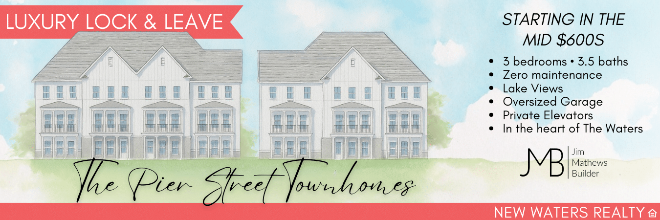 The Pier Street Townhomes bring together timeless architecture and modern convenience in the heart of The Waters. the Townhomes are designed for those seeking a “lock & leave” lifestyle, without sacrificing space, comfort, or quality.